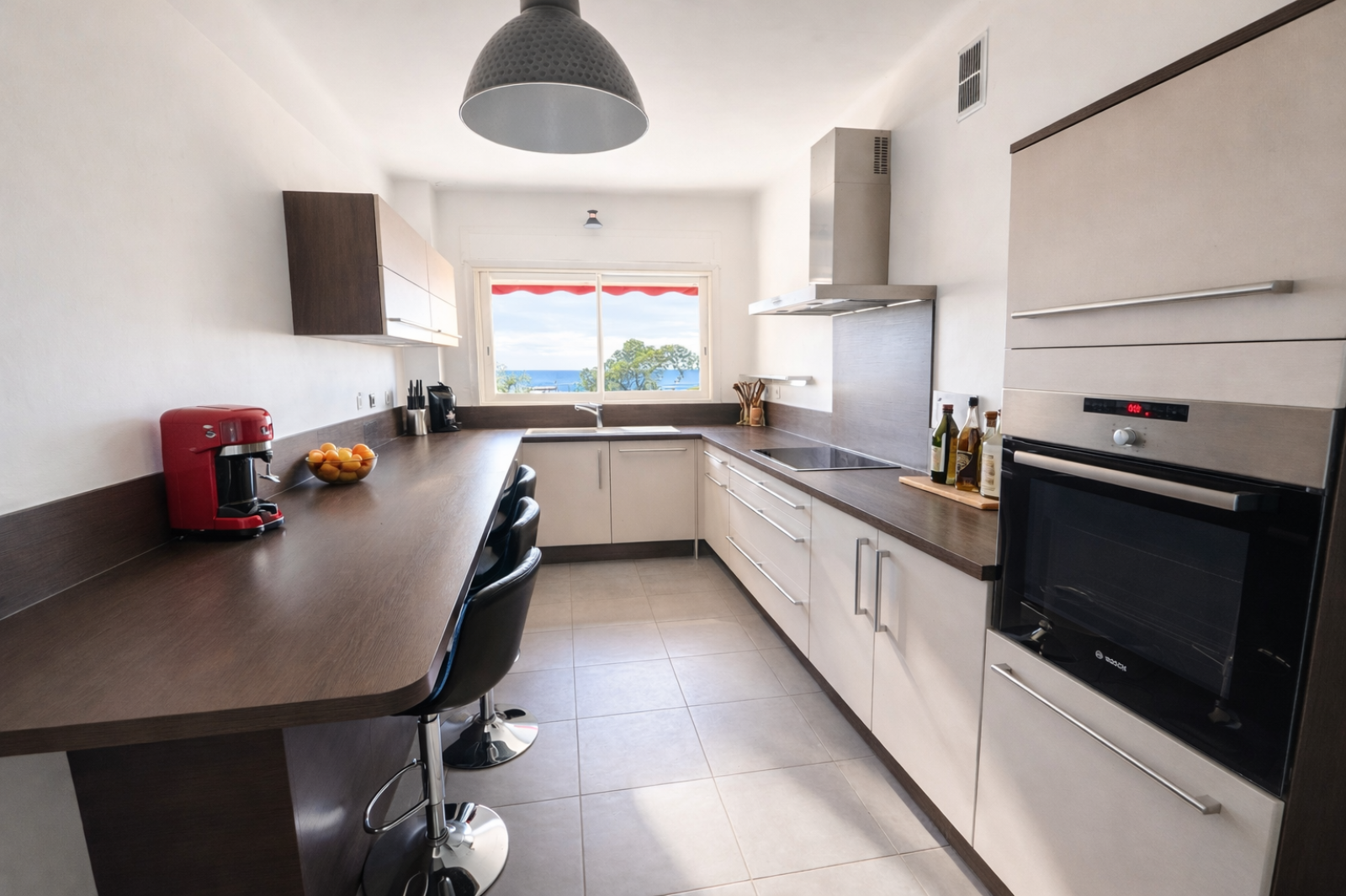 La réception, aux volumes généreux, s’ouvre sur une terrasse avec vue mer, véritable prolongement de l’espace de vie. La cuisine indépendante, entièrement équipée, se prolonge par une buanderie, apportant fonctionnalité et confort au quotidien.