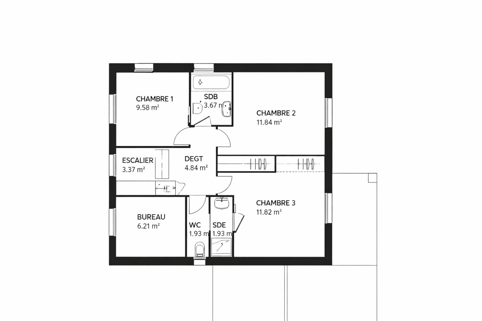 À l’étage, l’espace nuit s’organise autour d’une chambre parentale avec sa salle d’eau, complétée par deux chambres, un bureau, une salle de bain ainsi qu’un WC indépendant, offrant une configuration idéale pour la vie familiale.
