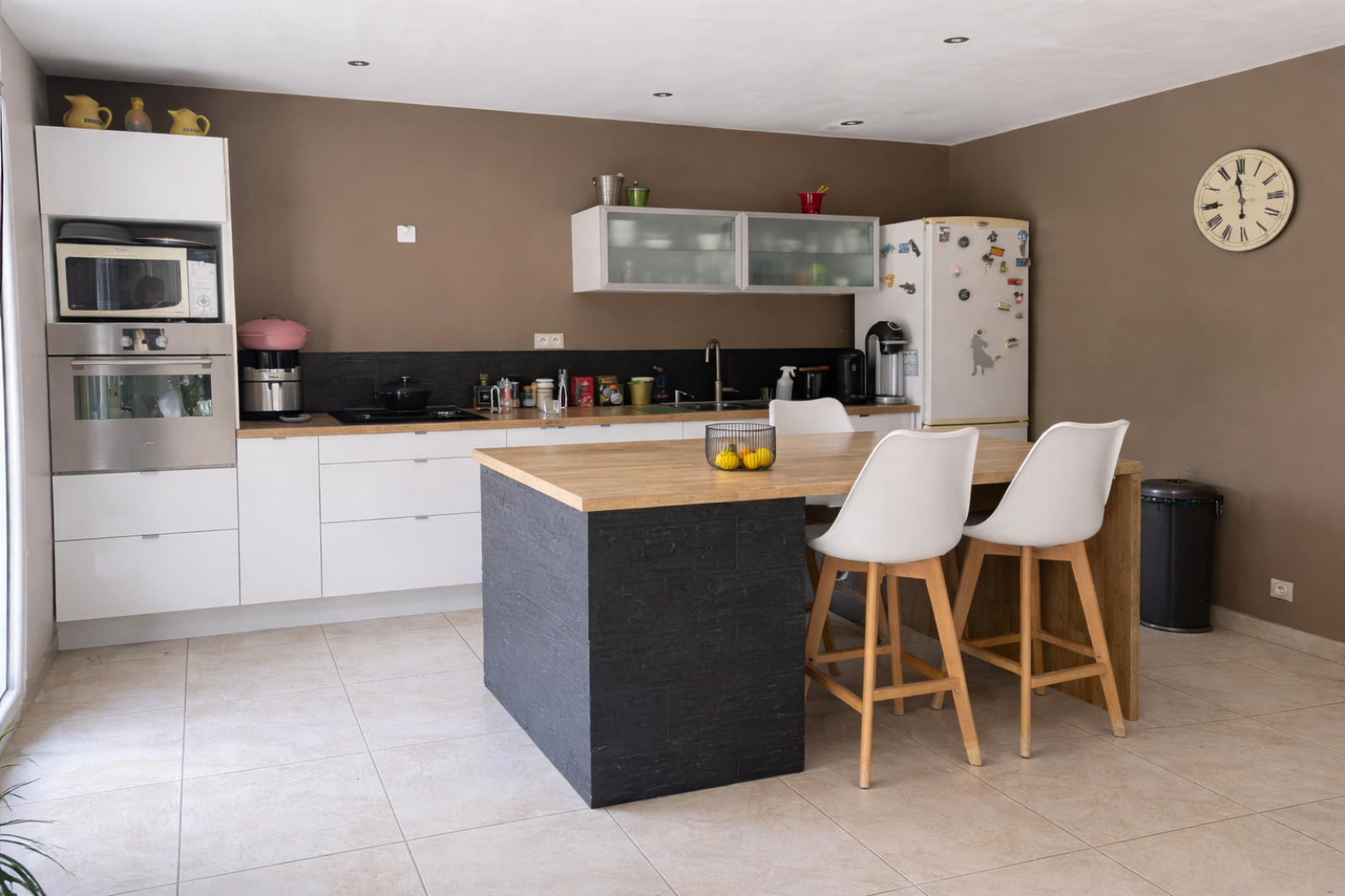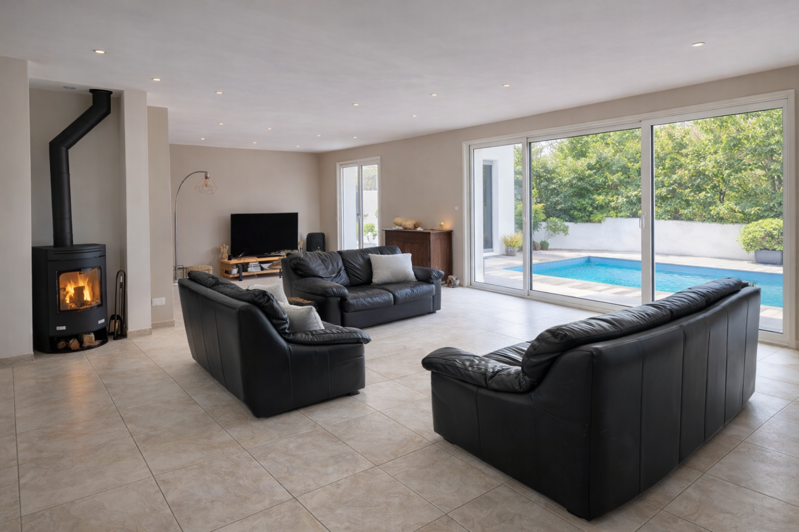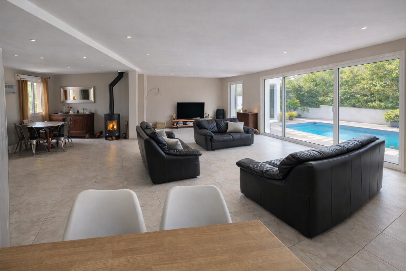 L’entrée s’ouvre sur une belle pièce de vie d’environ 50 m² réunissant entrée, séjour et cuisine, baignée de lumière et largement ouverte sur la terrasse et la piscine. Le séjour, agrémenté d’un poêle à bois, crée une atmosphère chaleureuse et conviviale.
